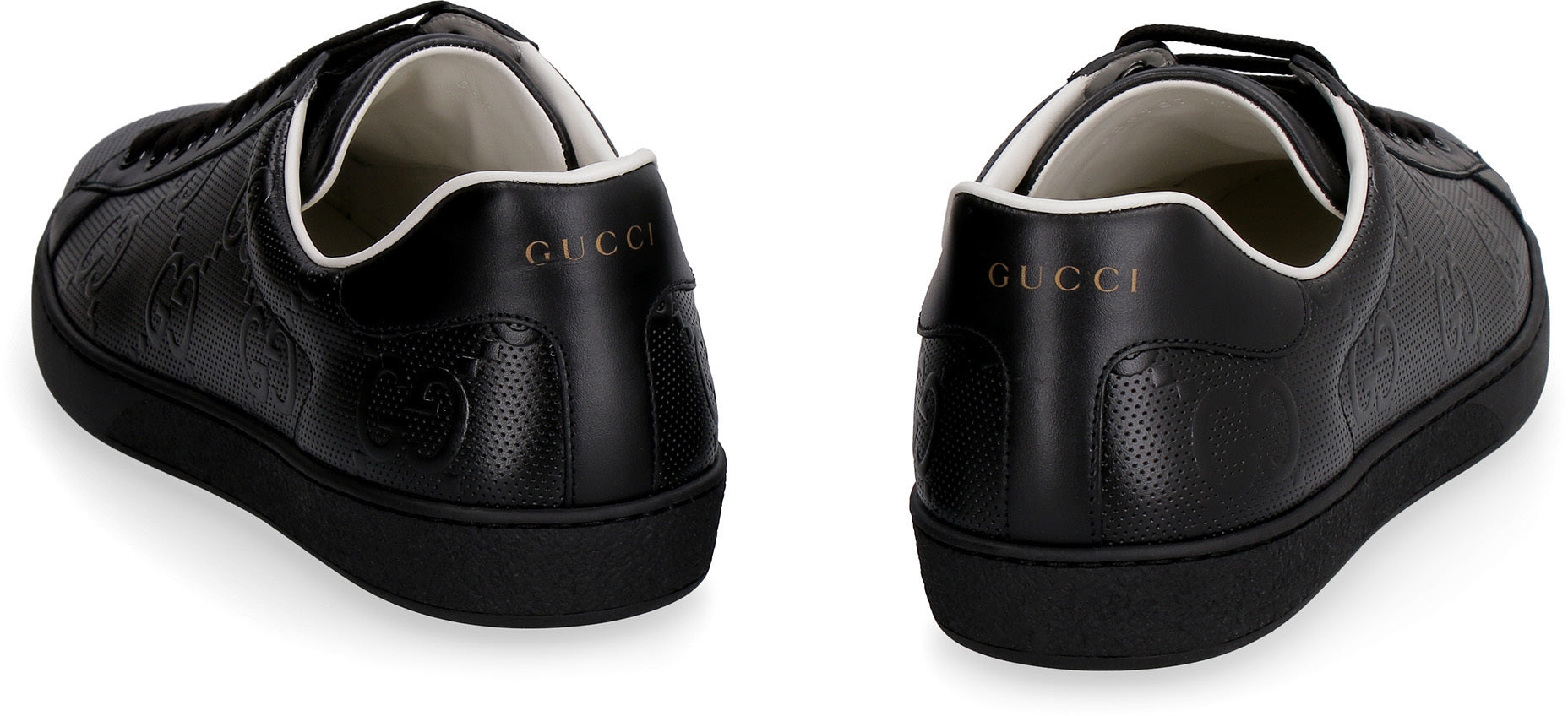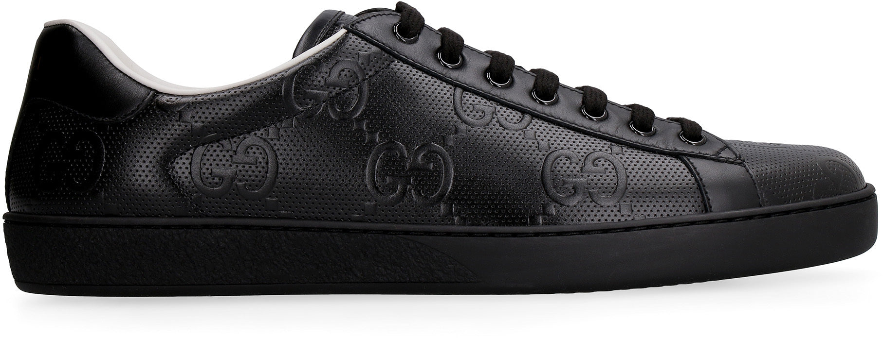 The Ace leather sneakers by Gucci showcase embossed leather craftsmanship and a classic round toeline. Made from 100% calf leather and featuring a durable rubber sole, these sneakers blend timeless design with modern comfort, making them a versatile addition to any wardrobe.